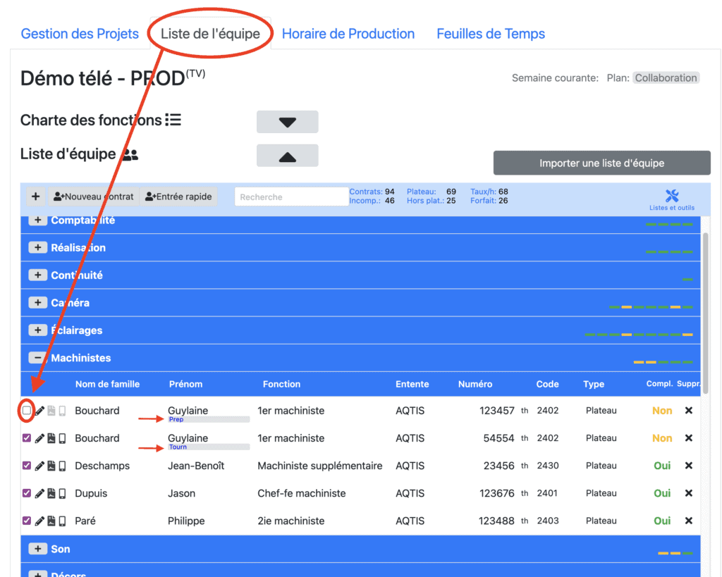 À l’onglet «Liste d’équipe» cliquez dans la case complètement à gauche du nom pour désactiver / activer chaque contrat. Vous pouvez aussi inscrire le nom de l’étiquette dans la section approprié du contrat. Cette étiquette apparaîtra sous le nom de la personne..