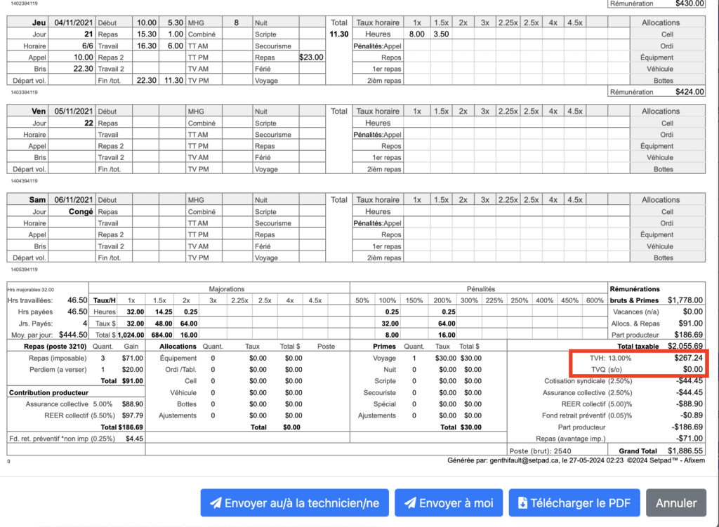 Vous pourrez voir le calcul de la TVH au bas de la feuille de temps calculée.