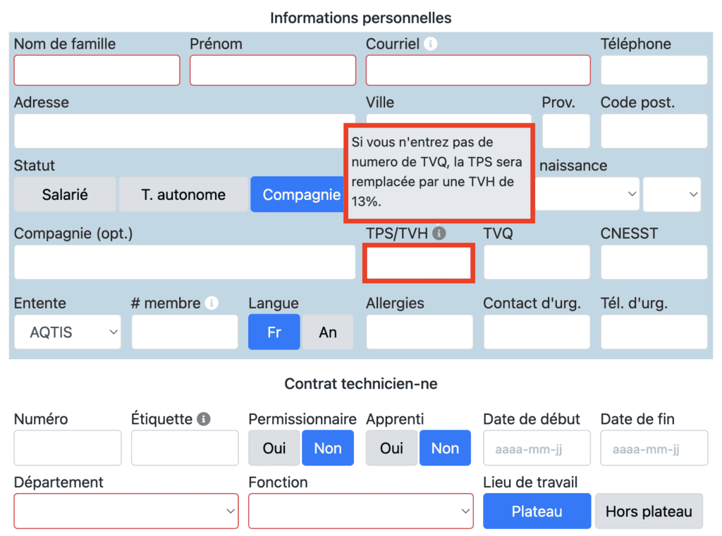 Il est possible de remplacer la TPS et la TVQ pour la taxe de vente harmonisée (TVH) pour les travailleurs autonomes et compagnies. Allez dans le contrat et cliquez sur «T. autonome» ou «Compagnie» et si vous n’inscrivez pas de numéro de TVQ et seulement un numéro de taxe dans le champs de la TPS, Setpad comprendra qu’il s’agit de la TVH et calculera automatiquement les taxes au taux de 13%.