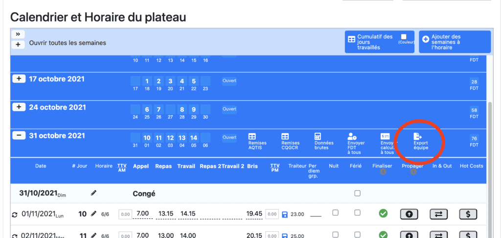 Une fois activé, vous verrez un nouveau bouton apparaître à la semaine dans Calendrier et Horaire du plateau à l’onglet Horaire de production.
