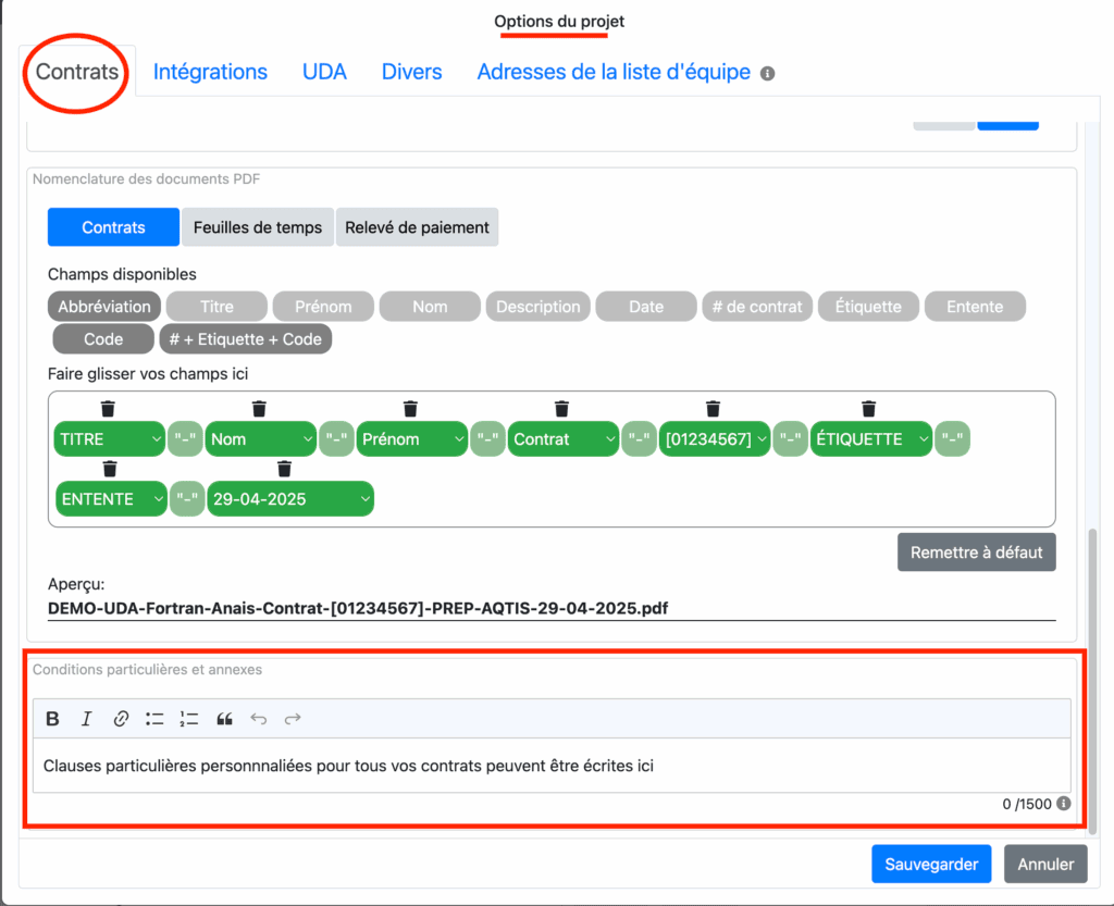 Il est possible d’écrire une clause pour tous les contrats générés dans Setpad. Vous pouvez personnaliser les clauses en allant dans les options du projet, à l’onglet Gestion des projets, et en remplissant le champ «Conditions particulières et annexes». Vous pouvez y inscrire jusqu’à 1500 caractères ainsi que d’ajouter des hyperliens vers vos documents en ligne.