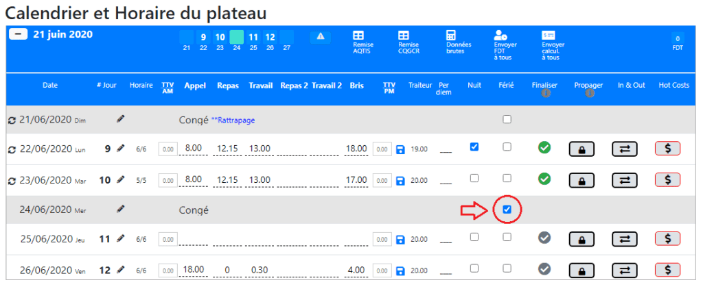 Note aux comptables: Pour une vérification des fériés calculés; dans l’onglet Feuilles de Temps, positionnez-vous en mode d’entrée équipe (journée) à la date du férié pour voir rapidement les techniciens qui reçoivent ou pas le férié (crochet vert à droite= férié calculé) et dans le cas où les crochets sont oranges, voyez si vous souhaitez vraiment les ignorer.