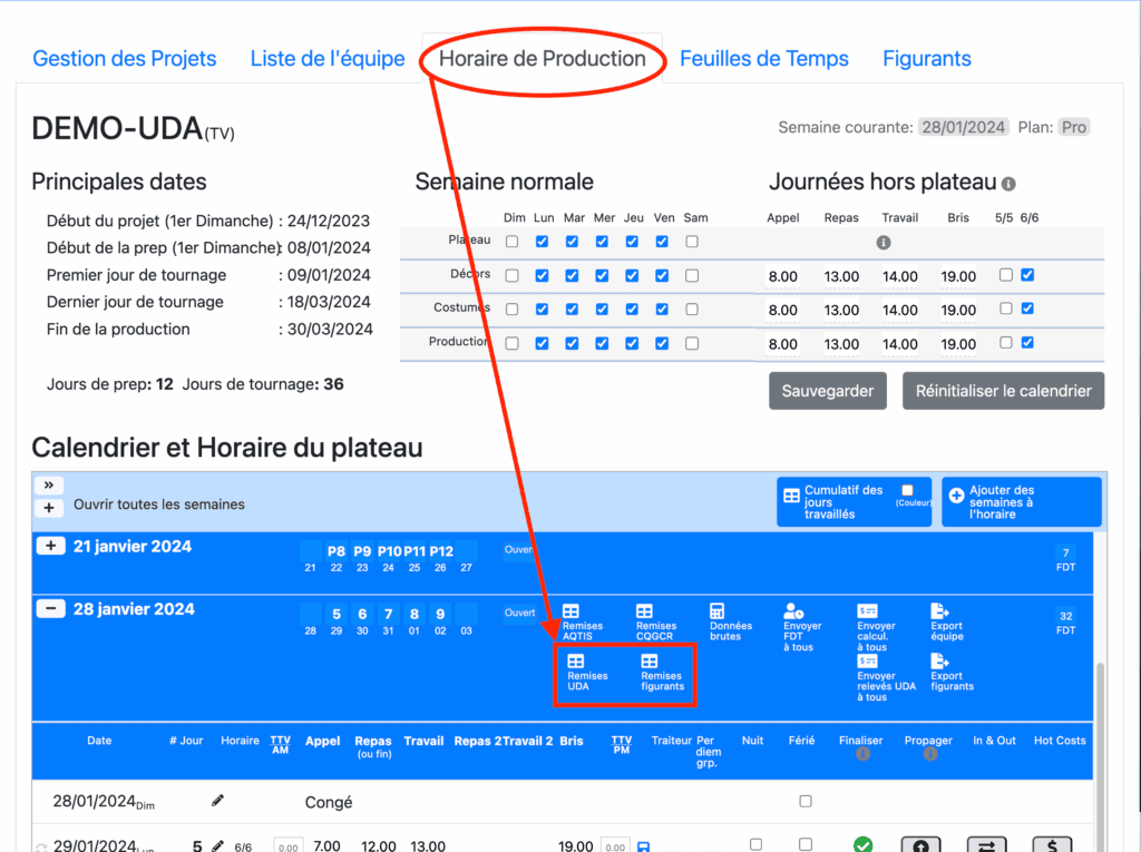 Vous avez accès aux remises UDA à la semaine dans le Calendrier et Horaire du plateau à l’onglet Horaire de Production. Vous pouvez obtenir ce document en Excel ou PDF.