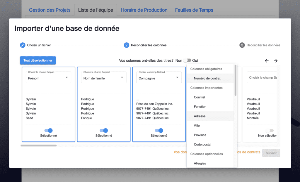 La réconciliation des colonnes est nécessaire, car les rubriques dans chaque fichier Filemaker ou Excel peuvent avoir un nom différent comme par exemple «First name» ou «prénom» ou encore «NAS» ou «ass. Sociale» ce qui veut dire la même chose, mais comme c’est écrit différemment, il n’est pas possible pour l’application de reconnaître toutes les possibilités. En réconciliant les colonnes, Setpad va se rappeler que vous avez identifié telle rubrique à tel champ et ce qui sera aussi gardé en mémoire pour les prochaines importations.