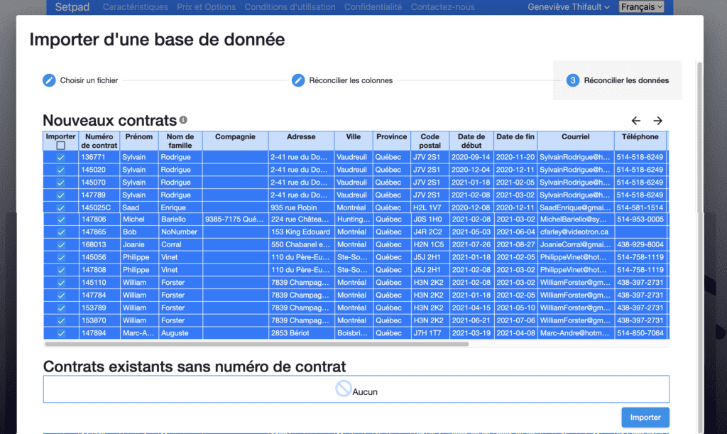 Sélectionner et visualisez tous les nouveaux contrats à importer. Notez que vous pouvez revenir en arrière en cliquant sur la deuxième étape «Réconcilier les colonnes».
