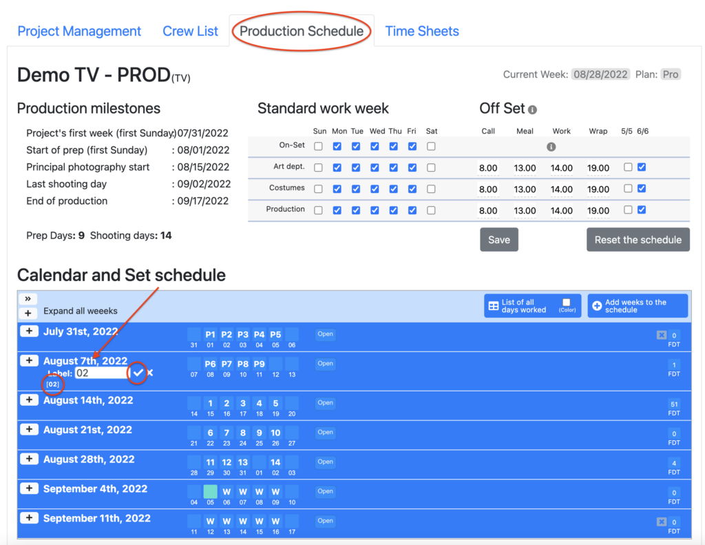 It is possible to label the pay week in each project. Eg. you are on pay period #04 for week X, you canInclude the pay period directly in the Schedule by going tothe correct week in the Calendar and Set Schedule by clicking on the date.