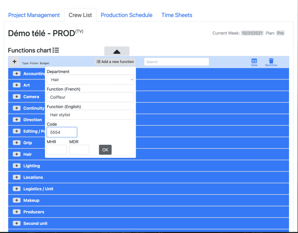 To do this, go to the Functions Chart in the “Crew List” tab. Start by creating the function in one or the other of the departments (e.g. Hairdressing Department), then choose a function (e.g. Hairdresser) in the function choices, then assign your budget code to it. Once created, you can return to modify this new function by clicking on it in your Chart (e.g. modify by Hairdresser / Makeup Artist) and save by clicking on the check mark.