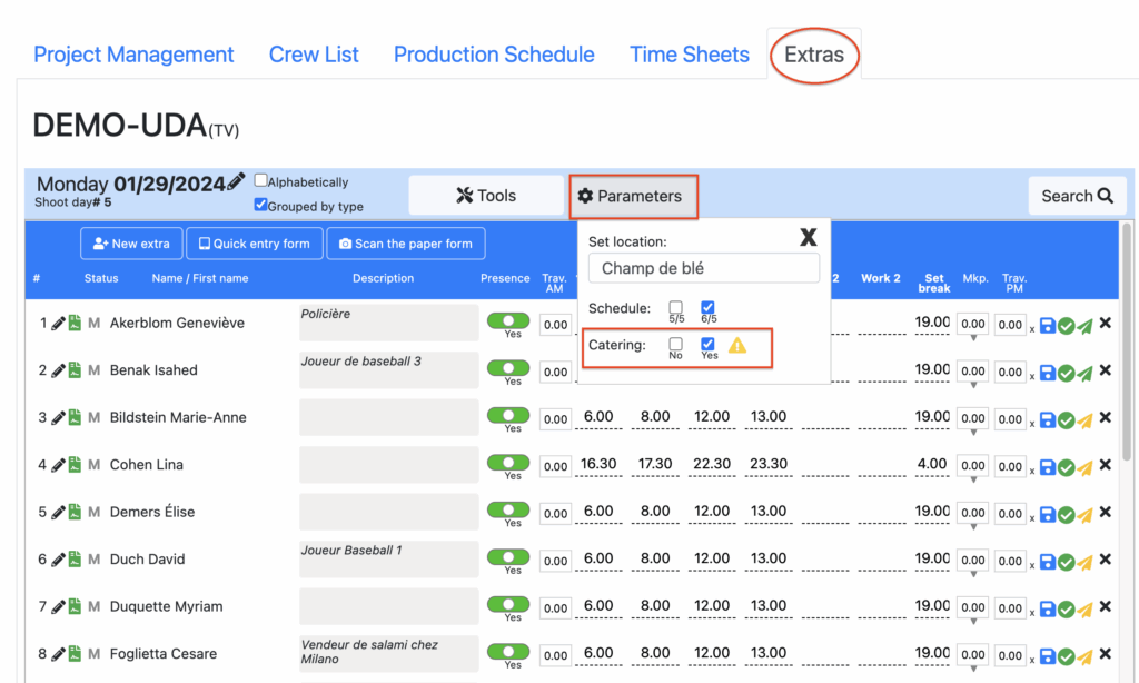 There is a catering option (yes/no) at the bottom of the extra’s personal profile
