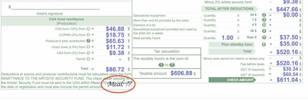 Here are the options for displaying the “Meals” mention at the bottom of the extra’s contract: