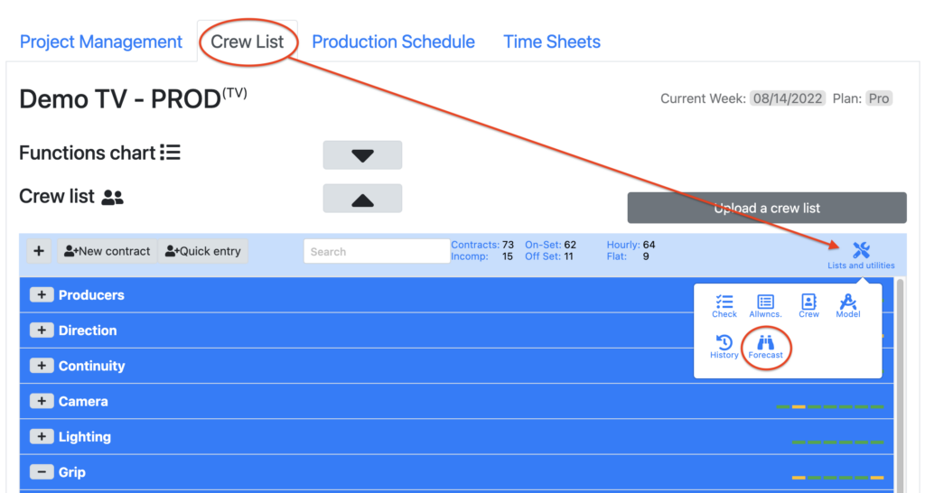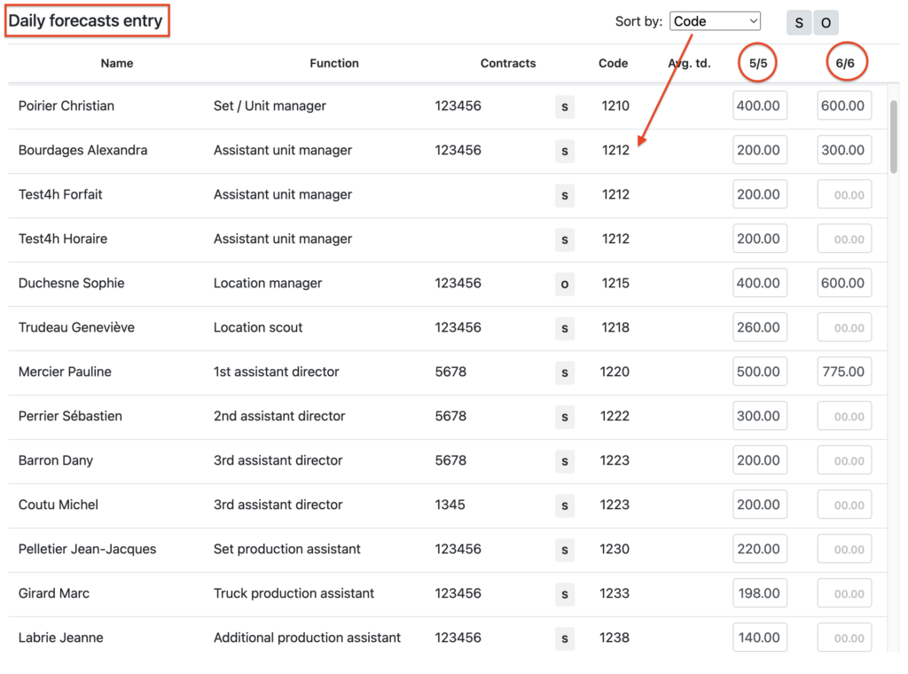 Setpad provides you with a table allowing you to quickly enter all your daily forecasts in 5/5 and/or 6/6 at once for all your contracts. These entries will automatically be entered into the technicians’ contracts. You can enter these forecasts by Accounting codes, by Name or by Department (On-Set or Off-Set).